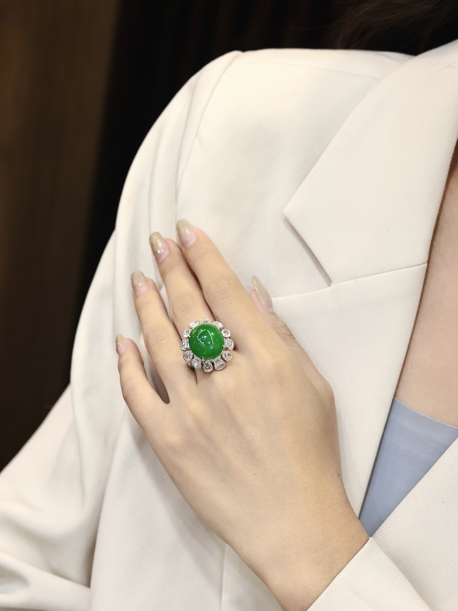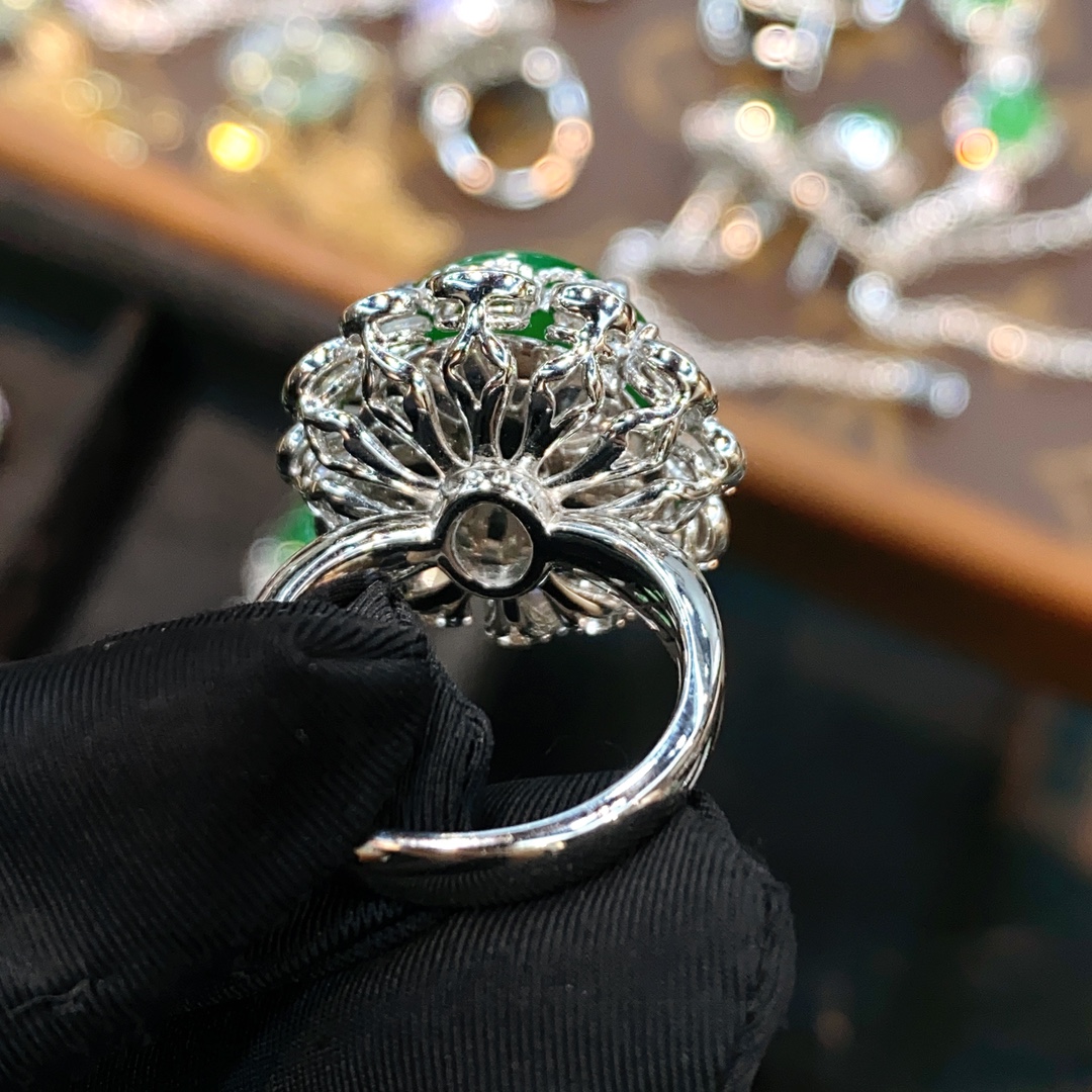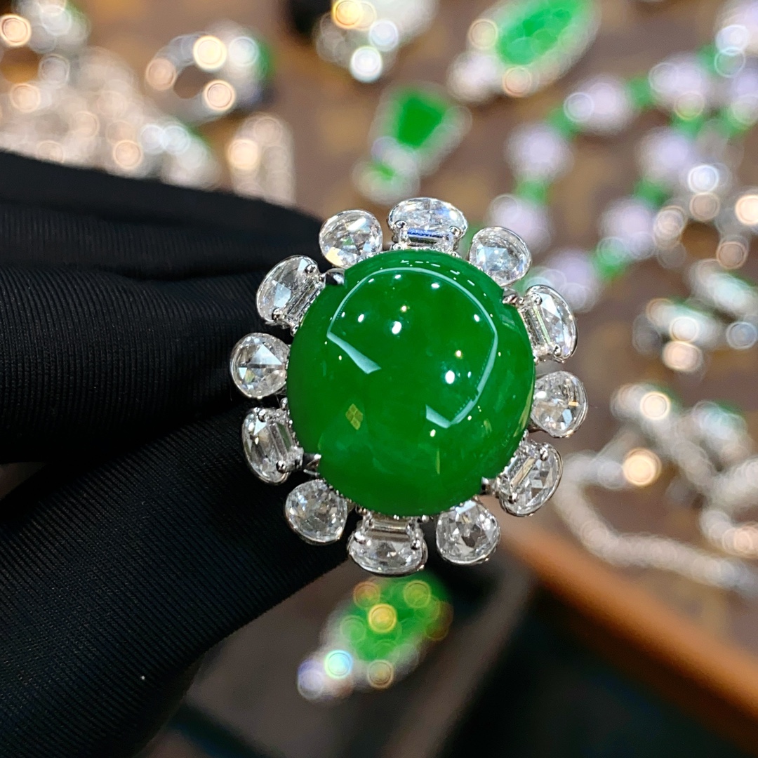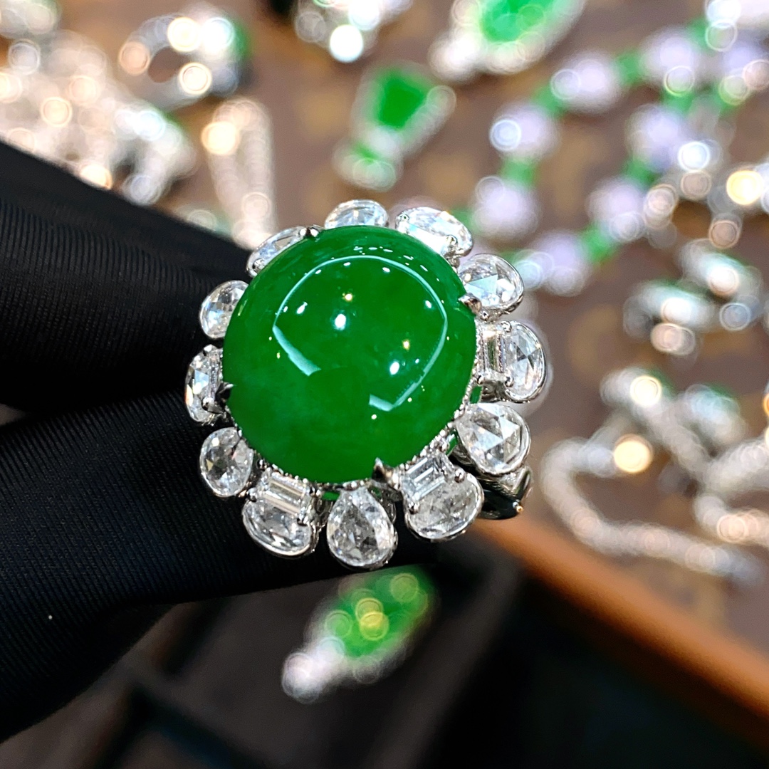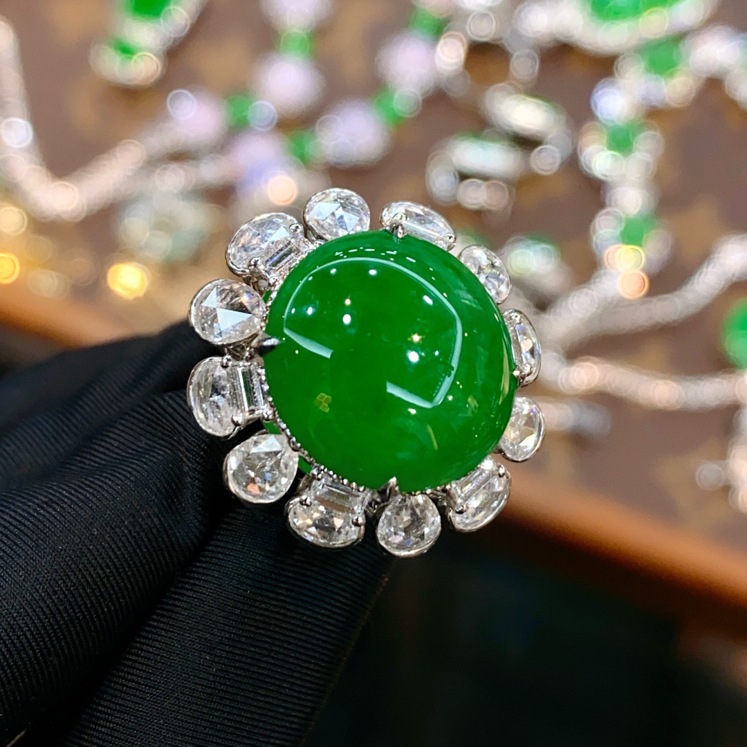 Emerald ring, full of green egg face ring, large diamond setting, overall: 23.1-22.15.5, bare stone: 15.0-13.5